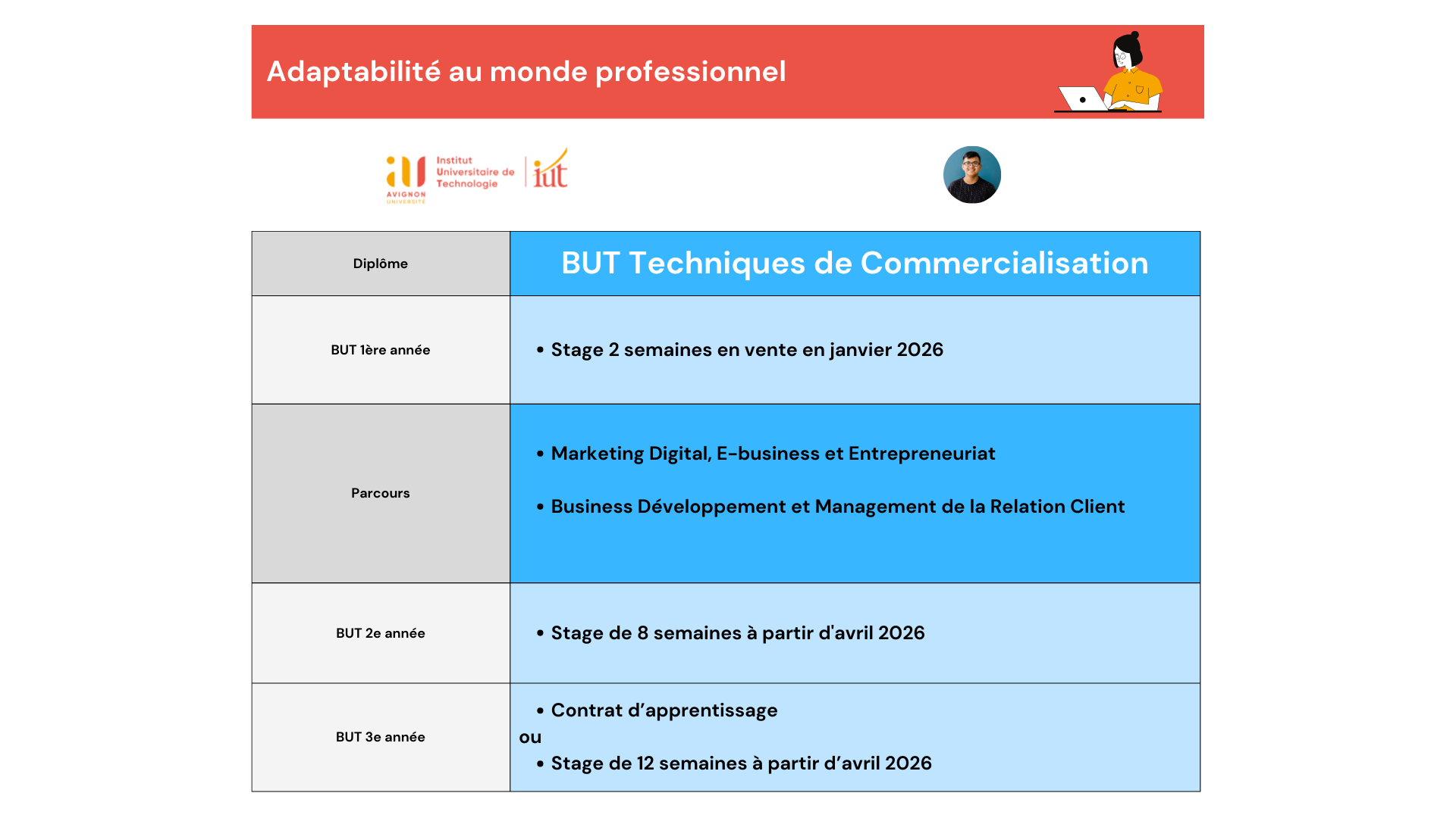 Work-linked training in the 3rd year of BUT for the 2 courses or 12 to 16 week work placement for the classic Marketing Digital E-business and Entrepreneurship (MDEE) course.